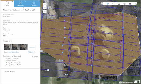 The Project pane is where you can review and manage your project. You can review the drone imagery in your collection by clicking a thumbnail of each image, and add more images to your project. Adding more images resets your project, requiring an updated block adjustment and product generation. Click Report to generate a block adjustment report. The report can be exported and saved to your desktop.