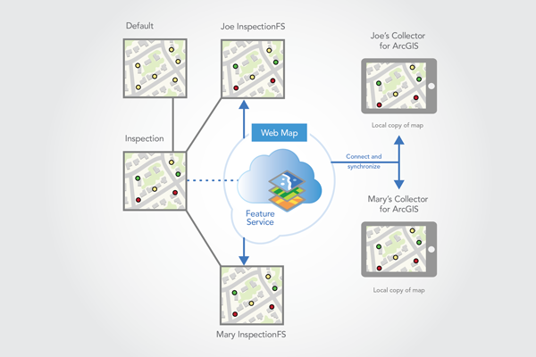 With this option, a version is generated for each user that downloads a map containing an editable feature service. For example, if 10 users download the same map, 10 versions are generated. Each version is specific to an individual user, and the version name is made up of the user name and service name (e.g., Joe_InspectionFS). If a user downloads the map multiple times (for example, from more than one device), the same version is used when the user synchronizes from each device. Thus one device has access to edits from the other device. However, newly downloaded maps will only be as up to date as the last time the user's version was reconciled. A user version remains as long as the user has a map downloaded.